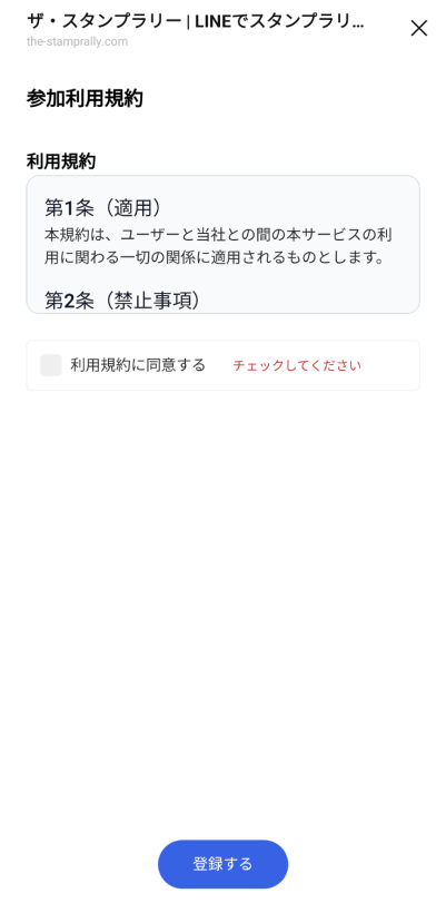 ザ・スタンプラリーを認証後、参加利用規約に同意し、アプリが利用できるようになります。(参加利用規約同意時に任意項目フォームの有無を選択できます)